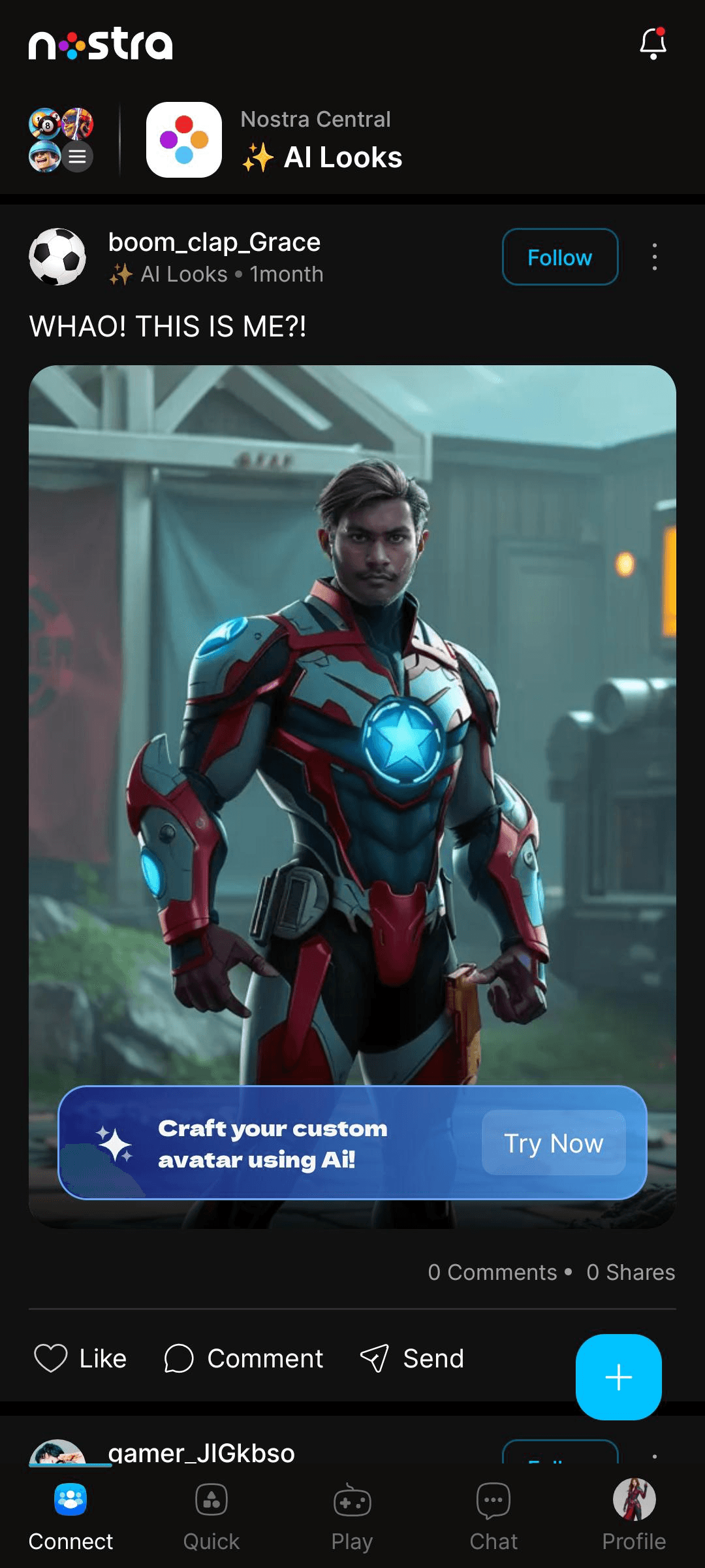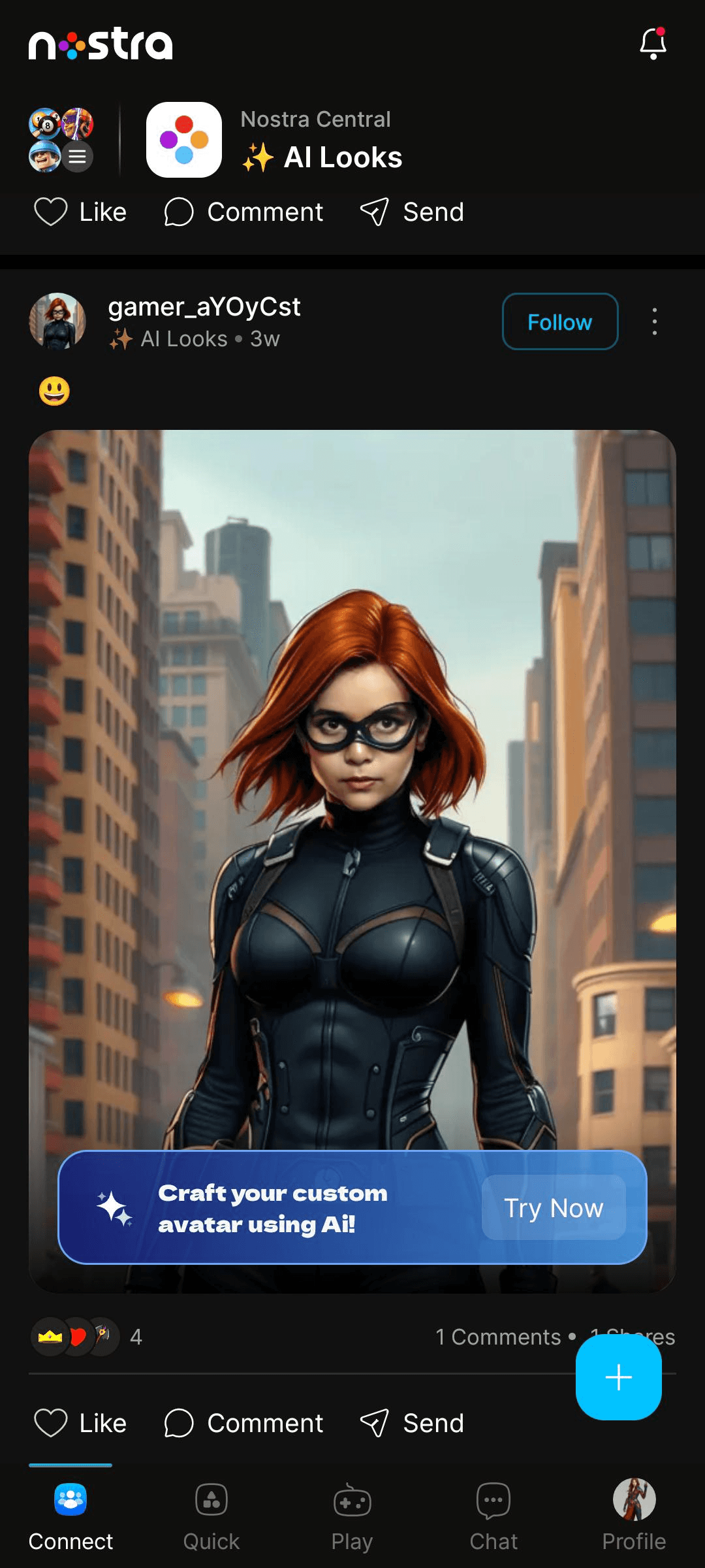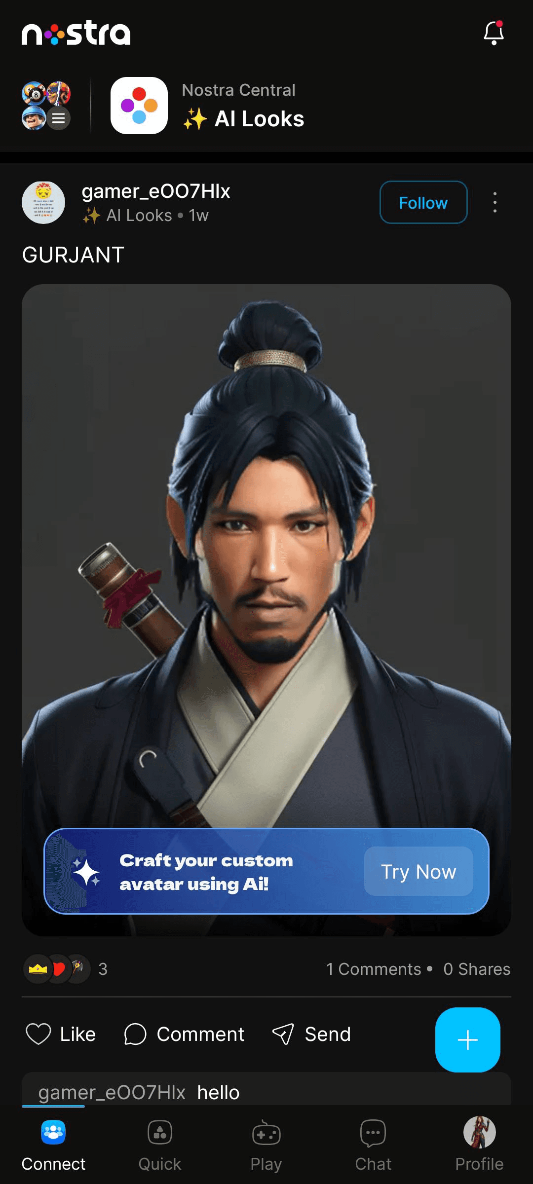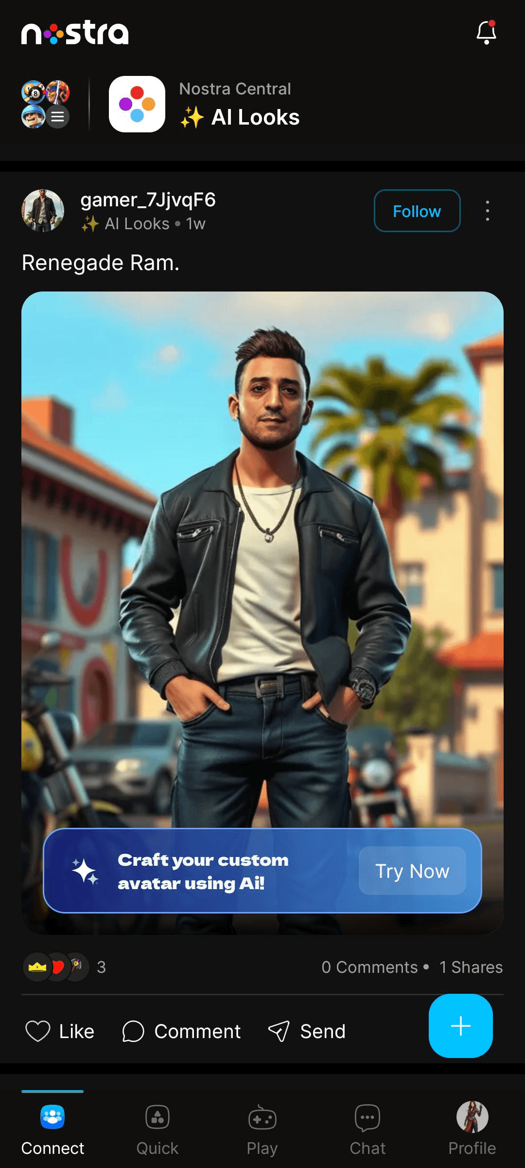 Within 10 seconds, 3 gaming looks are generated. If users don’t like them, they can keep generating new ones. They can also take actions like saving the look to their device, setting it as their Nostra profile, sending it in chats, or sharing it on social media.