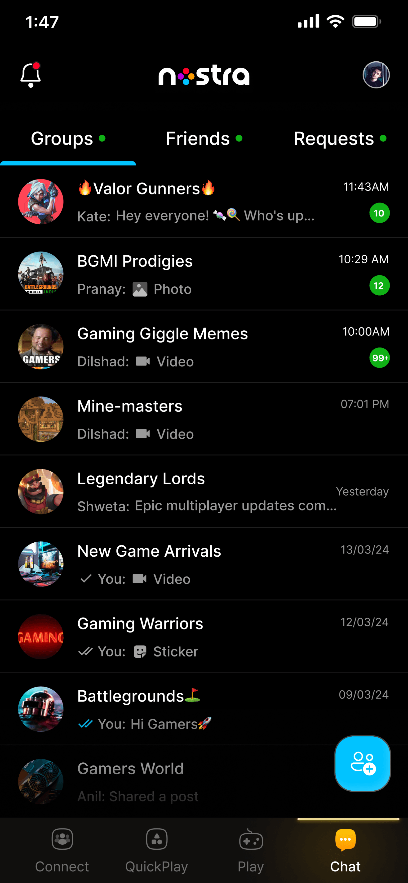 Nostra is a mobile-first gaming community app that brings players together through instant gameplay, group chats, and a vibrant social ecosystem. The app goes beyond solo play to create a space where users can connect with fellow gamers, join game-specific groups, and participate in live discussions and events.